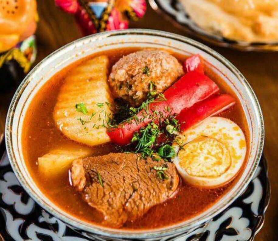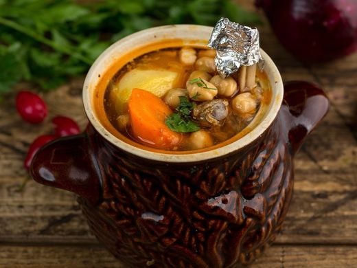 No‘xat, go‘sht va sabzavotli, qozonda pishirilgan to‘yimli sho‘rva