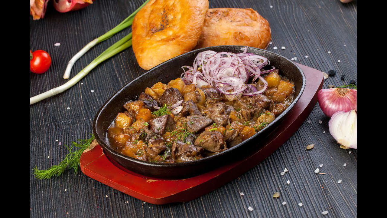 Piyoz va ko‘katlar bilan qovurilgan jigar bo‘laklari