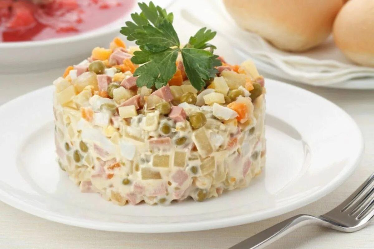 Mayonezli, to‘g‘ralgan sabzavot va go‘shtdan tayyorlangan klassik salat.