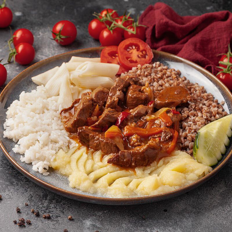 Qozoqcha pishirilgan to‘yimli go‘sht va sabzavot bo‘laklari