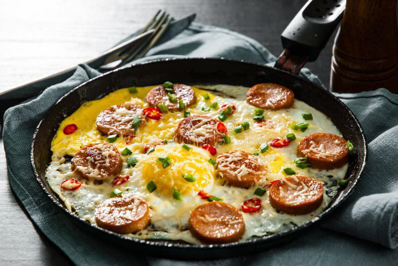 Qovurilgan tuxum bilan tortiladigan oddiy, to‘yimli qovurilgan kolbasa