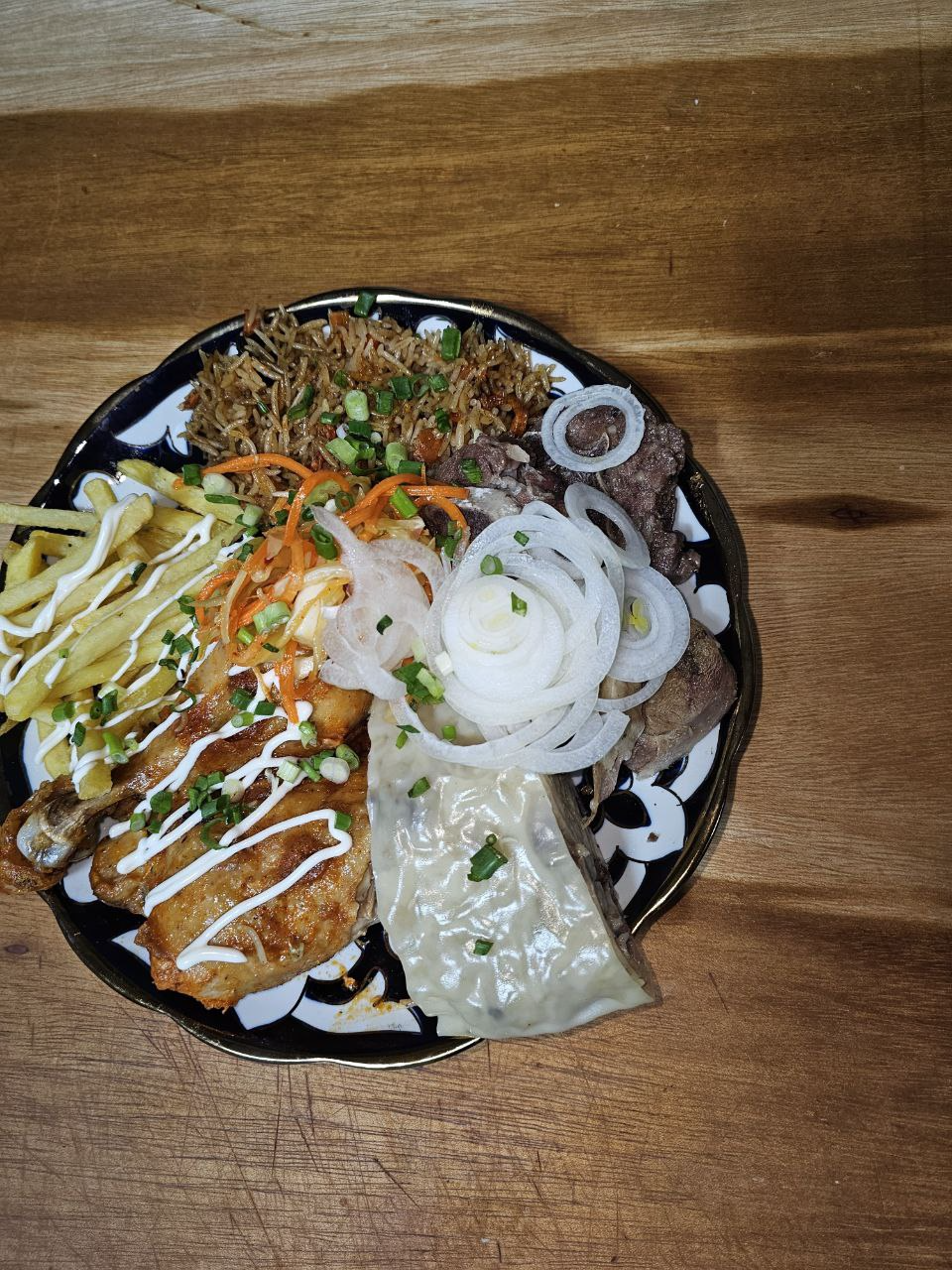 Grilda pishirilgan go‘shtlar (kabob) va yangi garnirlar aralashmasi
